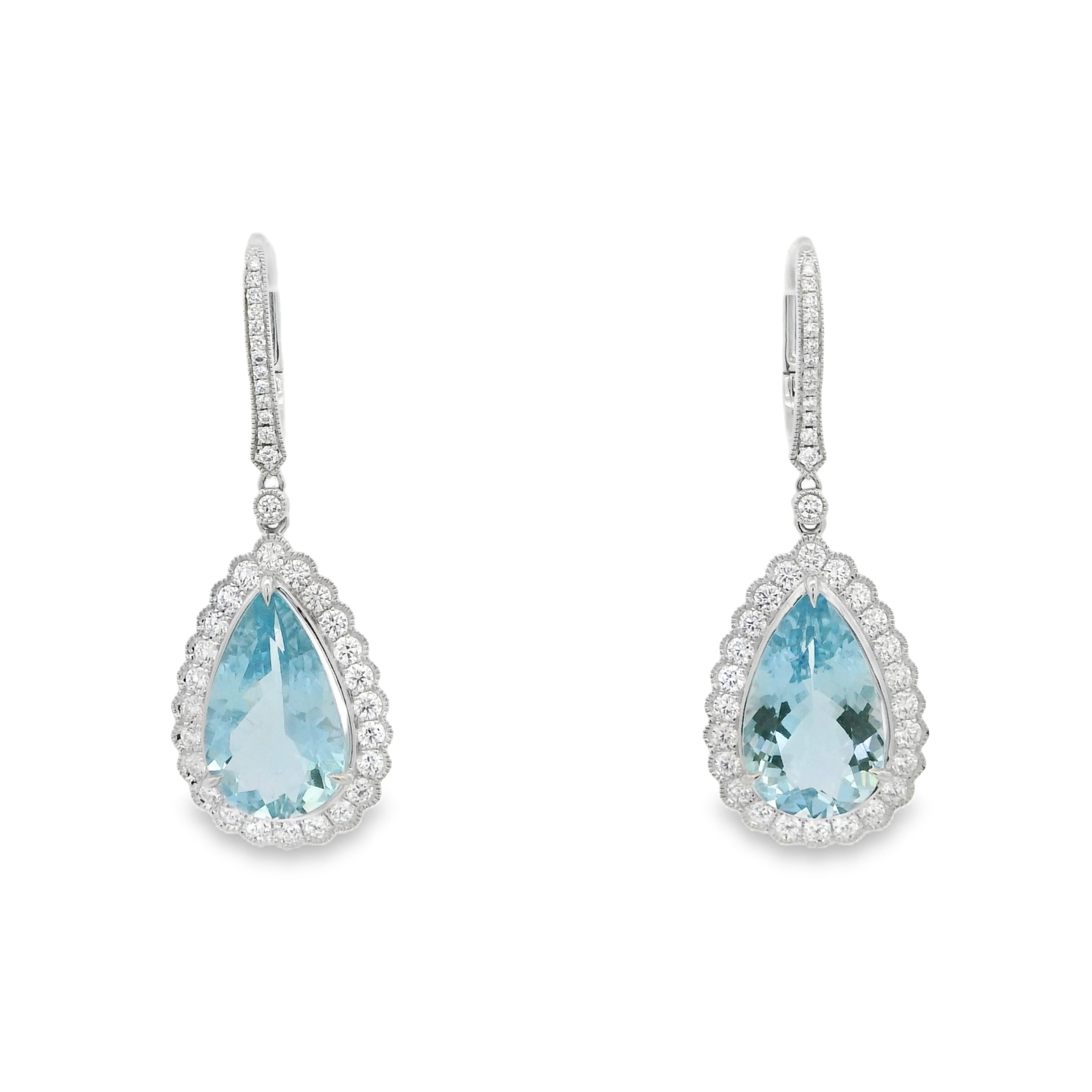 Veredeln Sie Ihren Stil mit diesen exquisiten Ohrhängern aus 750f Weißgold. Die faszinierenden tropfenförmigen Aquamarine sind fachmännisch geschliffen, um Lichtreflexion und Funkeln zu maximieren sie haben ein Gesammtgewicht von 8.42ct. Komplimentiert werden die Aquamarine mit insgesamt 1.55ct Diamanten im Brilliantschliff. Die ruhigen Blautöne der Aquamarine vermitteln Ruhe und Eleganz und machen diese Ohrringe zu einer zeitlosen Ergänzung jeder Schmucksammlung.