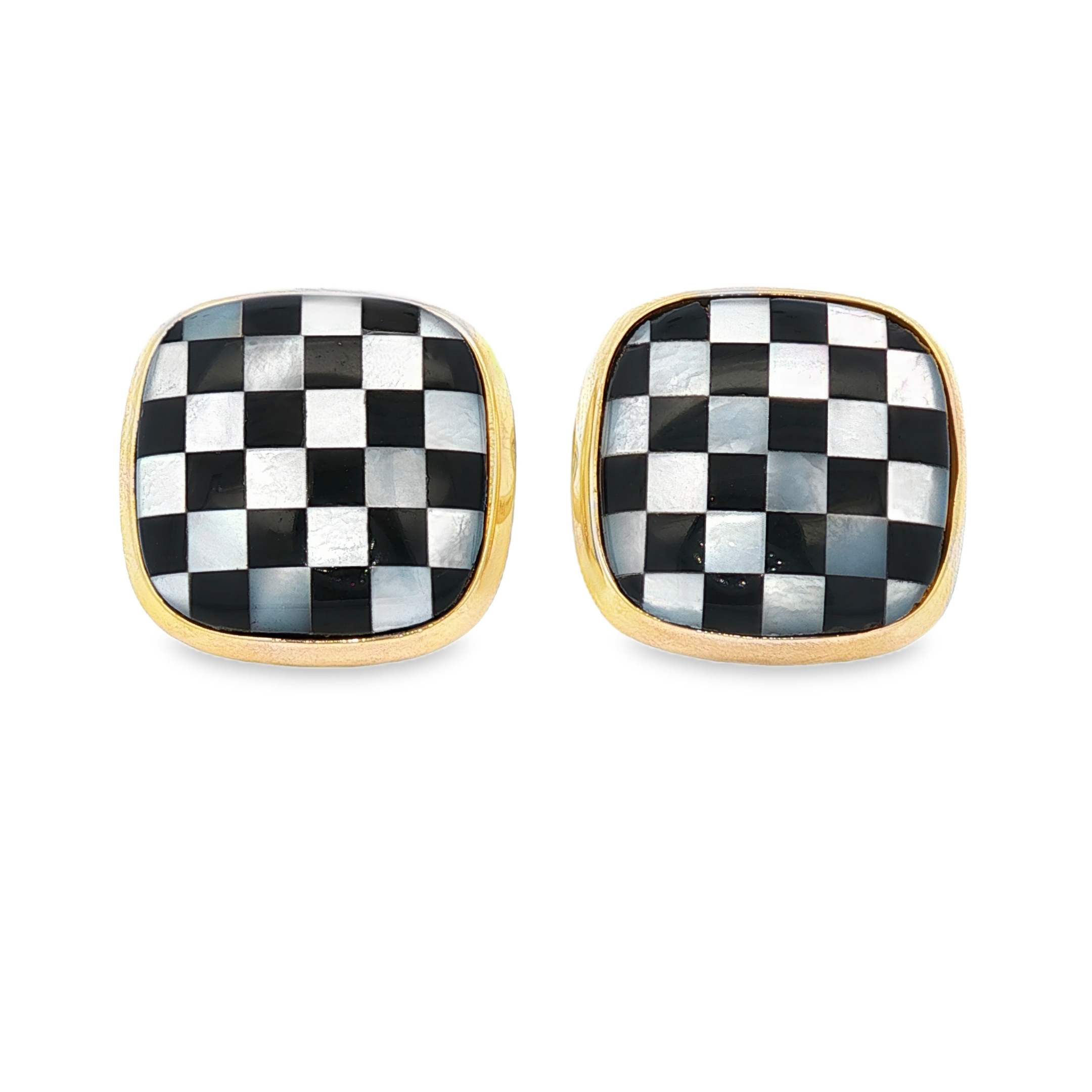 Handgefertigte Vintage Manschettenknöpfe aus Gelbgold mit Schachbrettmuster. Die Manschettenknöpfe sind ca. 1980 aus 585f Gelbgold gefertigt. Die Manschetten knöpfe Messen 20x20mm. Auf der Rückseite befindet sich ein Klapppatent.